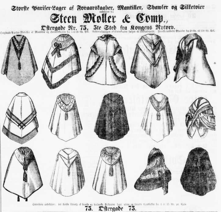 I perioden 1855 eller 1856 til 1867 holdt et firma ved navn Steen Møller & Co(mp) til i Østergade 75 (senere Østergade 10). Det har ikke været muligt at finde uddybende oplysninger på internettet, men gennem årene bragte aviserne helsides og halvsides annoncer fra firmaet, hvorfra er plukket de nedenstående.